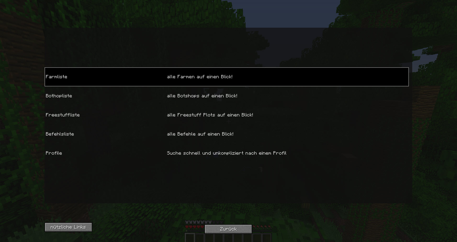 Befehle, Schnellportation, Spielersuche, Spielershops, allgemeine Hilfe, sowie das Einstellungsmenü der Mod.