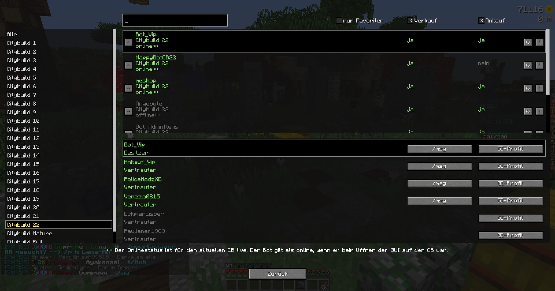 Wenn du einen Botshop anklickst, werden darunter die Ansprechpartner aufgelistet. Wenn der Ansprechpartner auf dem CB ist, wird er grün markiert und du kannst über den Button „MSG“ direkt eine Nachricht an ihn schreiben, sowie den Button „GI-Profil“ nutzen, um sein Profil in der Mod zu öffnen. Ist er nicht auf dem selben CB wie du, wird er grau angezeigt. Der „GI-Profil“-Button ist auch dann noch verfügbar.